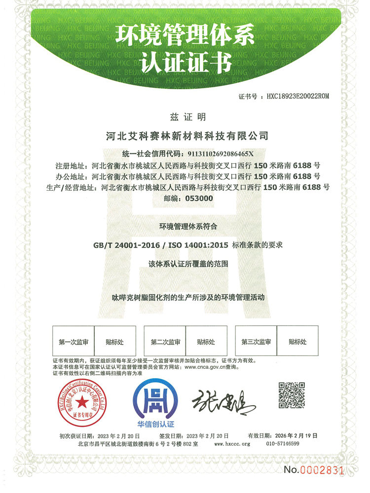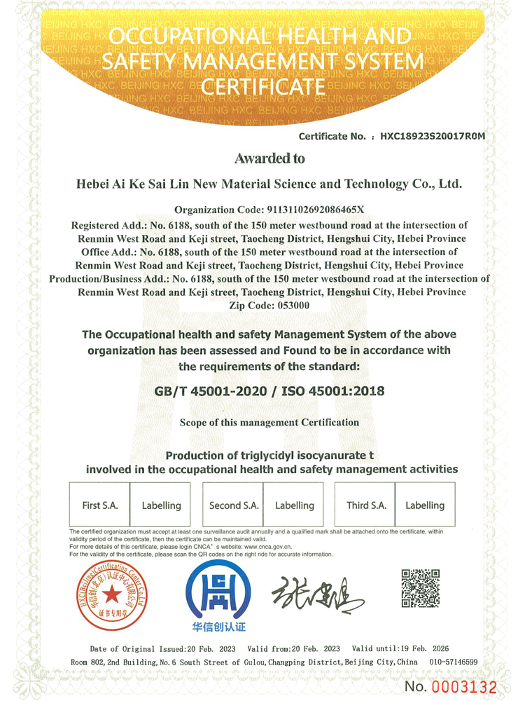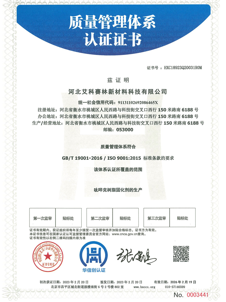 河北艾科賽林新材料科技有限公司成立于2009年,坐落在河北衡水桃城省級高新技術產業園區,占地100畝,注冊資金2500萬元,是一家以粉末涂料固化劑及高性能特種材料研發、生產、銷售為一體的高新技術企業。在激烈的市場競爭中不斷壯大,產品憑借良好的信譽與精益求精的工藝,在市場中取得良譽和好評。公司已通過ISO9001質量管理體系,IS014001環境管理體系、ISO45001職業健康安全管理體系。公司被認定為“高新技術企業”,河北省“專精特新”中小企業,先后獲得河北省行業“技術創新先進企業”,桃城“校企合作創新優秀企業”、畝均“納稅貢獻先進企業”等榮譽稱號......